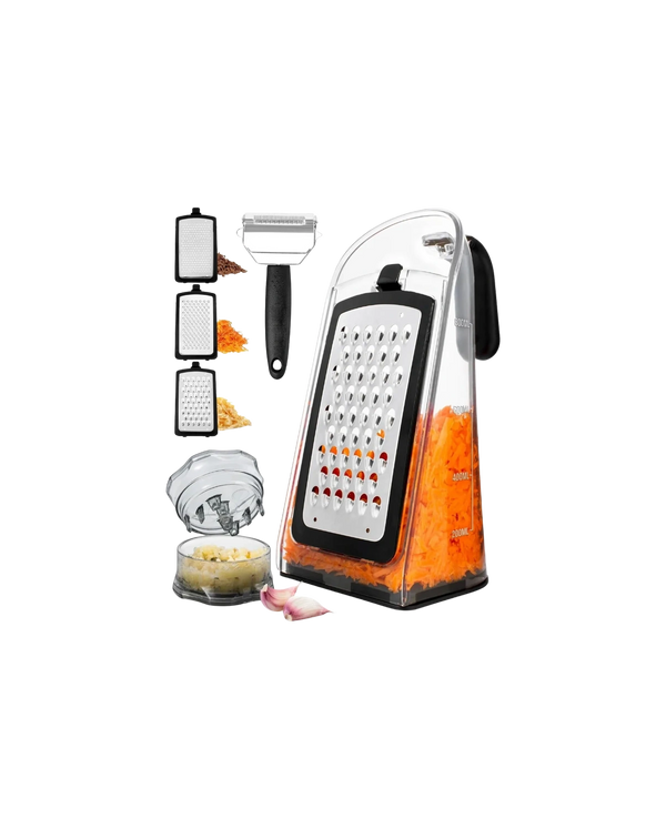 Hand Grater with Bonus Garlic Press Includes 3 different grating surfaces, removable non-slip base, 2 different measurement units, a thick and comfortable handle, and vegetable peeler. In addition, this versatile kitchen gadget comes with a garlic mincer that can be used as a herb grinder, garlic peeler and garlic chopper. It will streamline your cooking by multitasking as a ginger grater, carrot shredder, parmesan cheese grater and much more.
